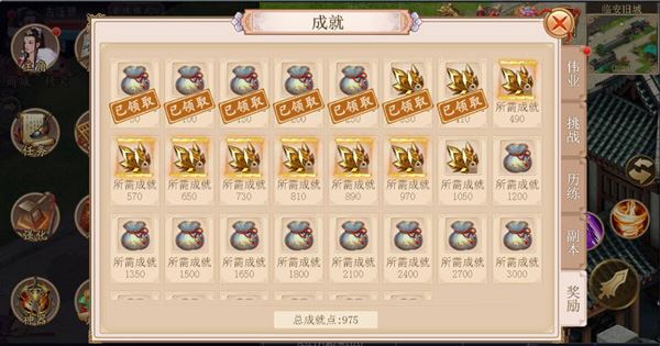 成就系统分为伟业、挑战、副本和成长四大类,每个类别下又有若干子类成就。