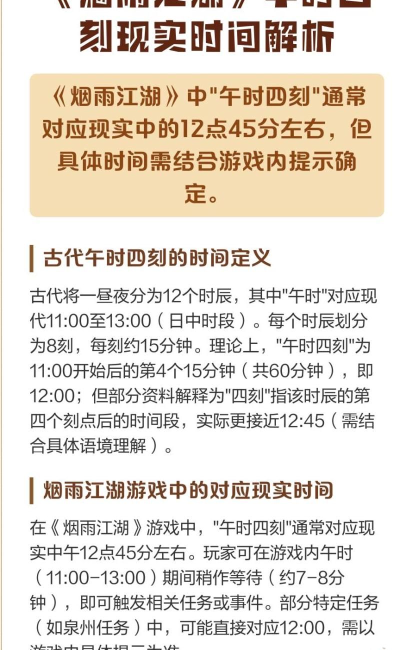 烟雨江湖中一个游戏时辰严格对应现实时间的十分钟,这是游戏时间换算的核心规则。游戏内完整的一天划分为十二个时辰,与现实两小时等长,这种设计构建了独特的江湖时间流速,直接影响所有动态事件与资源循环。玩家需明确此刻度方能精准规划任务路径,避免错过限时触发的剧情或NPC交互,时辰流转成为探索进程中的无形坐标。